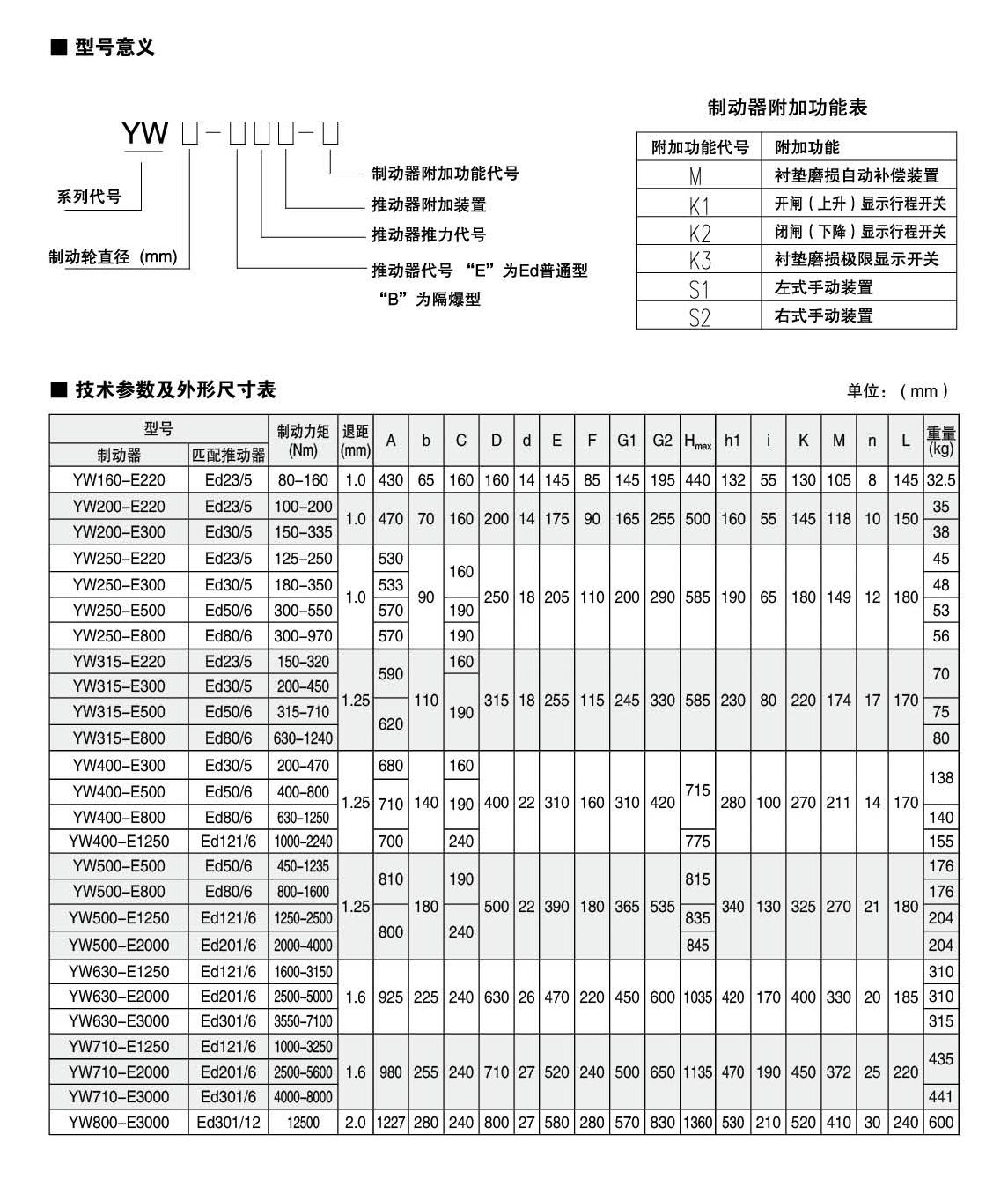 應(yīng)用:YW,YWZ13系列電力液壓鼓式制動(dòng)器,廣泛應(yīng)用于有防爆要求的各種起重運(yùn)輸、皮帶運(yùn)輸、港口裝卸、冶金及建筑機(jī)械中各種機(jī)構(gòu)的減速和停車(維持)制動(dòng)。符合標(biāo)準(zhǔn):YW,YWZ13系列電力液壓鼓式制動(dòng)器的連接尺寸和技術(shù)要求符合JB / T6406-2006標(biāo)準(zhǔn);制動(dòng)力矩參數(shù)符合DIN15435標(biāo)準(zhǔn),配套符合DIN15430標(biāo)準(zhǔn)的Ed系列推動(dòng)器。主要特點(diǎn):▲ 聯(lián)鎖式退距均等裝置和瓦塊自動(dòng)隨位裝置,可始終保持兩側(cè)瓦塊退距均等且無需調(diào)整,完全避免因退距不均使一側(cè)制動(dòng)襯墊浮貼制動(dòng)輪的現(xiàn)象;▲ 主要擺動(dòng)鉸點(diǎn)均設(shè)有自潤滑軸承,傳動(dòng)效率高,壽命長,使用中無需潤滑;▲ 制動(dòng)彈簧在方管內(nèi)布置并設(shè)有標(biāo)尺,用戶可十分方便地讀出制動(dòng)力矩值,免去測量和計(jì)算的麻煩;▲ 制動(dòng)襯墊為卡裝式整體成型結(jié)構(gòu),更換十分方便、快捷,備有半金屬(無石棉)硬質(zhì)和半硬質(zhì),軟質(zhì)(無石棉)等不同材質(zhì)的制動(dòng)襯墊供用戶選擇;▲ 配套Ed系列電力液壓推動(dòng)器產(chǎn)品,動(dòng)作靈敏、使用壽命長;▲ 常閉式設(shè)計(jì),(斷電)彈簧制動(dòng),(通電)推動(dòng)器釋放。工作條件:◆ 海拔高度:<2000m;◆ 環(huán)境溫度:-20°C?+ 40°C;◆ 相對(duì)濕度:≤90%;◆ 工作制:間歇性(S3-60%)和連續(xù)(S1);◆ 電源電壓:三相交流,AC380 50Hz (其他電源等級(jí)可按需要定制);◆ 有特殊要求時(shí)在訂貨時(shí)協(xié)商確定?;緟?shù):● 產(chǎn)品型號(hào):YW-160、YW-200、YW-250、YW-315、YW-400、YW-500、YW-630、YW-710、YW-800● 適用輪徑:160~800mm● 制動(dòng)力矩:80~12500Nm● 產(chǎn)品型號(hào):YWZ13-200、YWZ13-250、YWZ13-315、YWZ13-400、YWZ13-500、YWZ13-630、YWZ13-710、YWZ13-800● 適用輪徑:200~800mm● 制動(dòng)力矩:80~12500Nm