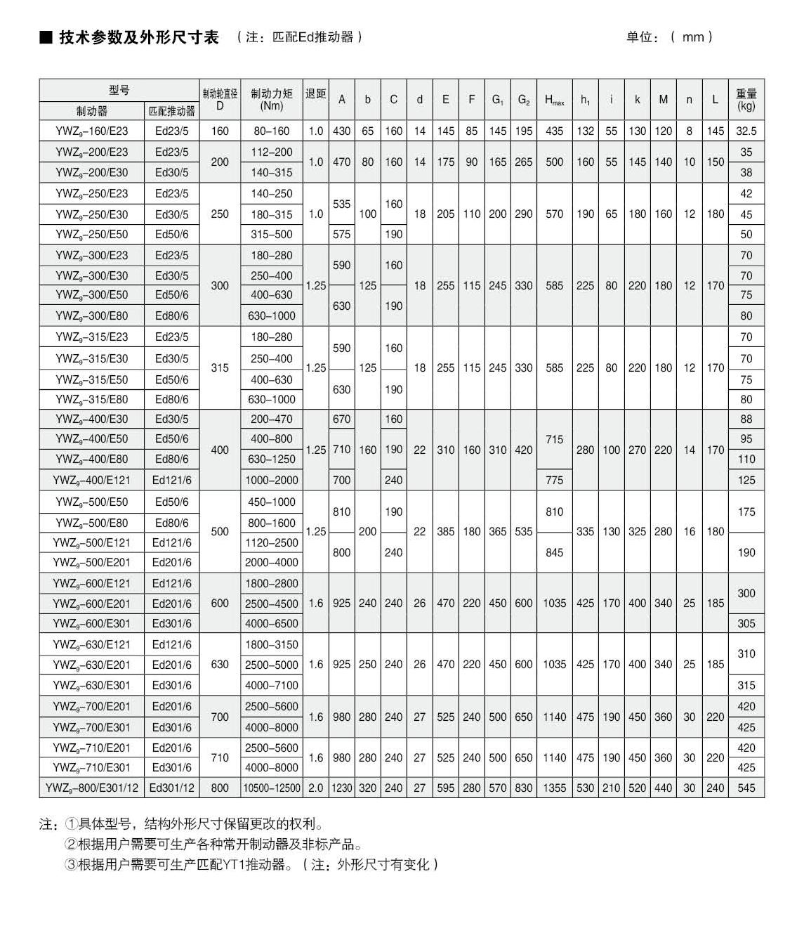 YWZ5系列電力液壓鼓式制動(dòng)器的連接尺寸和制動(dòng)力矩參數(shù)符合GB6333-86標(biāo)準(zhǔn),技術(shù)要求符合JB / T6406-2006標(biāo)準(zhǔn),配套符合DIN15430標(biāo)準(zhǔn)的Ed系列推動(dòng)器。