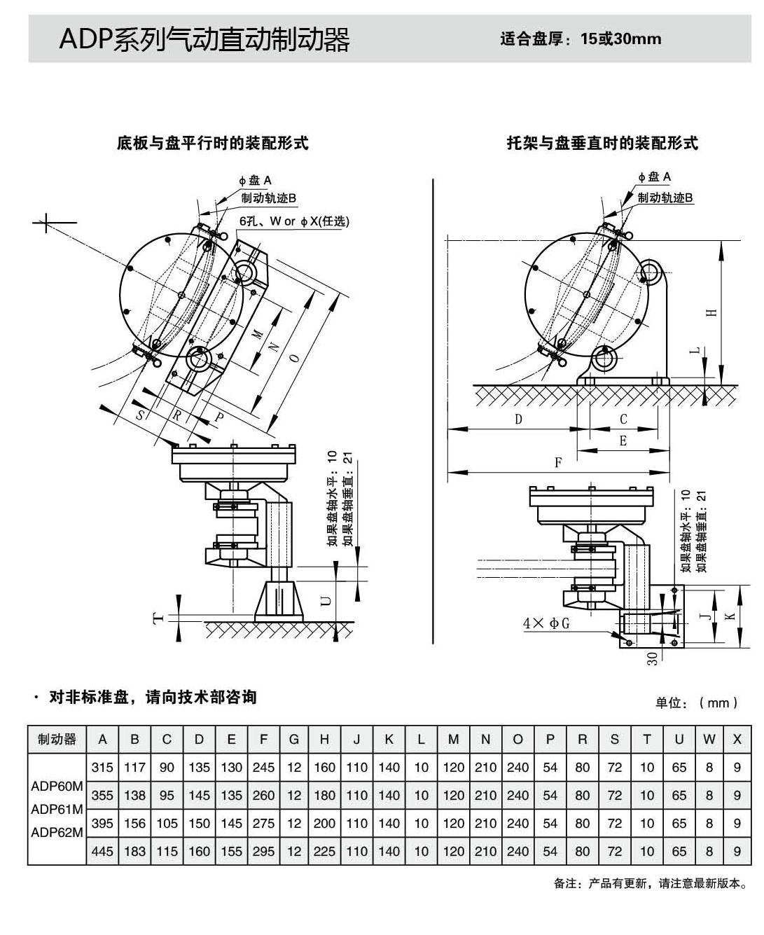 ▲ 安裝方式:適合于水平軸或垂直軸制動方式。水平軸制動方式時,可沿制動盤周圍任意角度安裝,但是水平安裝;垂直軸制動方式時,角度不限。一個制動盤,可安裝一臺制動器,也可安裝兩臺或兩臺以上制動器,但安裝兩臺或兩臺以上時建議盡量對稱安裝;